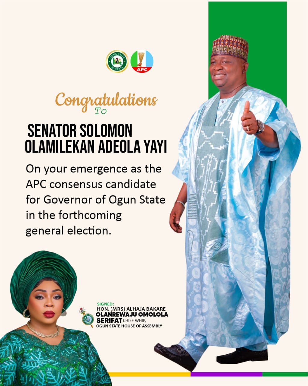 OGUN EAST FOR YAYI CONGRATULATES APC CONCENSUS GOVERNORSHIP CANDIDATE, SENATOR SOLOMON OLAMILEKAN ADEOLA YAYI